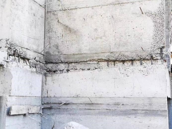 據上述建筑不遠處有一棟在建10層建筑(圖3),形狀不太規則,可以看到墻肢底部的彎曲型破壞和連梁的破壞(圖4、圖5),上部結構未觀察到損傷,整體結構依然站立。