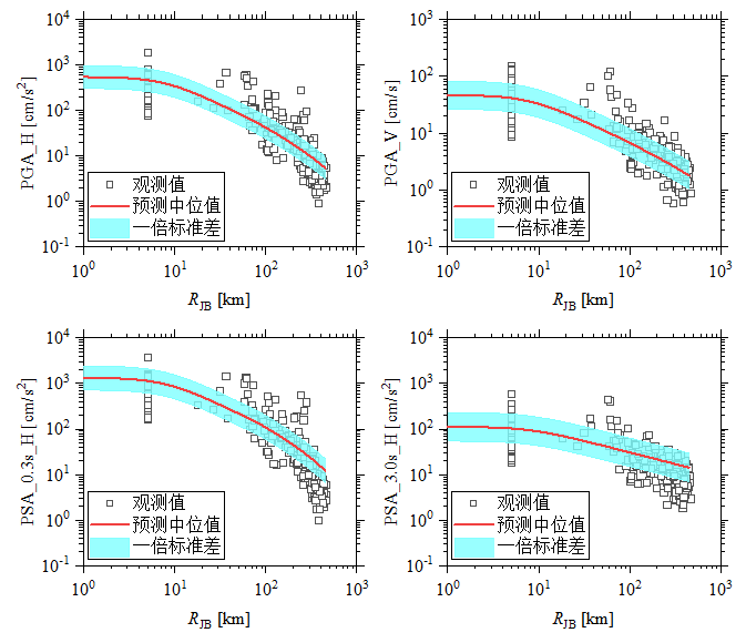 圖1 Mw7.8土耳其地震觀測記錄強度指標隨距離衰減及其與預測中位值的對比