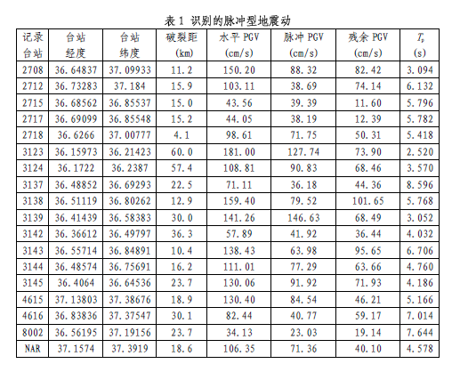 利用強震動觀測記錄識別了此次地震中近斷層地震動是否存在速度脈沖效應。結果顯示,公開發布的18組強震動記錄是典型的脈沖型地震動(見表1),部分脈沖記錄及提取的速度脈沖見圖2。