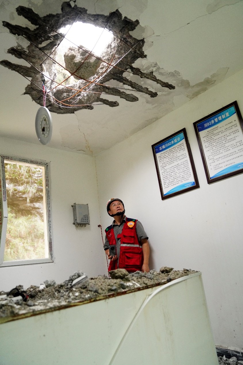 石棉線科考組圍繞石棉川02井、擦羅強(qiáng)震臺(tái)站、栗子坪強(qiáng)震臺(tái)站開展了周邊建筑震害調(diào)查。該區(qū)域儀器烈度與實(shí)際建筑破壞程度基本相符,考察區(qū)域的大部分震害為非結(jié)構(gòu)構(gòu)件的破壞,如框架結(jié)構(gòu)填充墻開裂、瓷磚脫落等。科考組考察到的2008年汶川地震后援建的中小學(xué)校舍在此次地震中表現(xiàn)良好,幾無震害。個(gè)別房屋出現(xiàn)了屋蓋和墻壁被落石直接擊穿的震害。