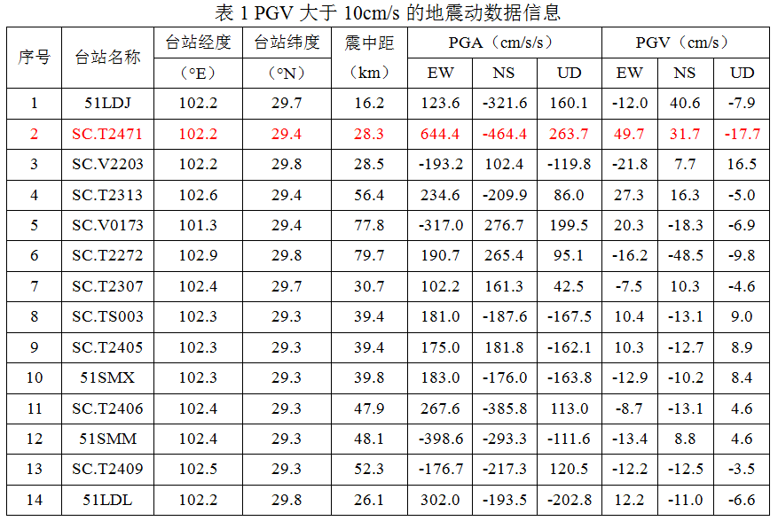 2022年9月5日12時52分,四川省甘孜州瀘定縣發(fā)生6.8級地震,我所強震動觀測中心在震后共收集處理距震中100公里范圍內強震動記錄110組。其中PGV大于10cm/s的數據14組,PGV大于20cm/s的數據6組,基本信息見下表1。本次地震的卓越頻率范圍較寬,不同臺站區(qū)別較大,如SC.W3509臺站記錄到的地震動卓越頻率在5Hz左右,SC.T2313臺站記錄到的地震動卓越頻率在2.5Hz左右,SC.T2302臺站記錄到的地震動在1Hz左右有明顯的峰值,且其在0.1-1.2Hz范圍內均具有比較豐富的頻率成分。
