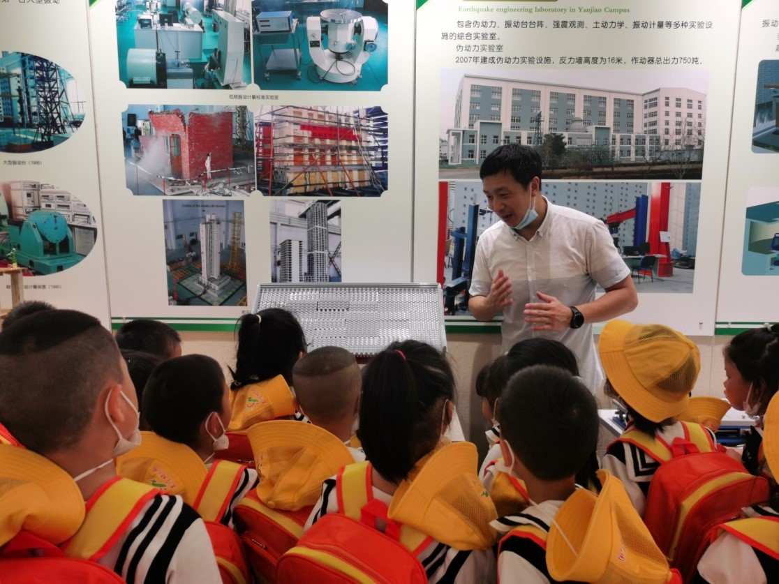 講座結(jié)束后,張昊宇博士帶領(lǐng)學(xué)生們進行了一系列的科普實驗。首先是參觀鐵路地震監(jiān)測預(yù)警系統(tǒng)展臺,講解地震后該系統(tǒng)如何保障高鐵安全運行的原理;其次回答學(xué)生關(guān)于“中國古建筑為何能夠跨越千年不倒”的問題,為學(xué)生講解中國傳統(tǒng)木結(jié)構(gòu)的抗震機理;最后進行的微型振動臺模擬實驗和搖擺墻結(jié)構(gòu)無損倒塌模型實驗是活動中學(xué)生們最喜歡的環(huán)節(jié),每一位學(xué)生都親手操作搖擺墻結(jié)構(gòu)無損倒塌模型,近距離直觀的認識到不同建筑結(jié)構(gòu)抗震能力的強弱區(qū)別,學(xué)習(xí)了建筑結(jié)構(gòu)抗震的基本知識。