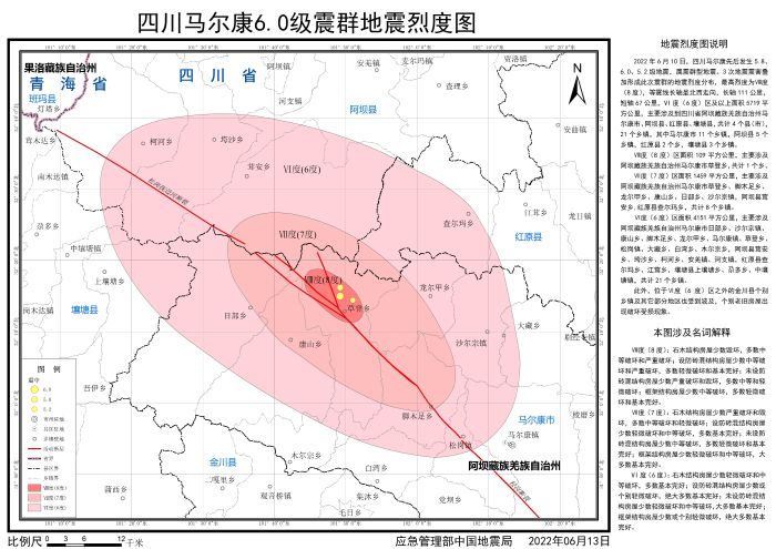 發布時間: 2022-06-22 點擊數量:95272022年6月10日,四川阿壩州馬爾康市先后發生5.8、6.0、5.2級地震,屬震群型地震。地震發生后,按照應急管理部部署,中國地震局組織四川省地震局開展應急處置工作,依照《地震現場工作 第3部分:調查規范》(GB/T 18208.3-2011)、《中國地震烈度表》(GB/T 17742-2020),通過災區震害調查,并綜合應用儀器烈度、地震構造背景、余震分布、震源機制、遙感影像等科技支撐成果,確定了此次地震的烈度分布,并依照《地震烈度圖制圖規范》(GB/T 38226-2019)編制完成《四川馬爾康6.0級震群地震烈度圖》。