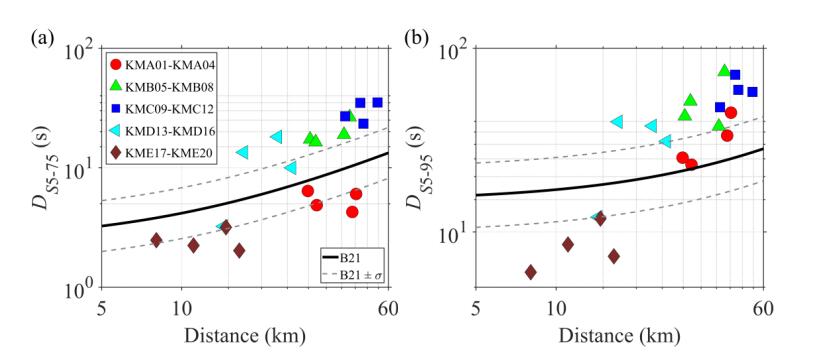 圖2 2016年Mw6.0 Off-Mie地震的顯著持時與陸域GMPEs的比較:(a) DS5-75和(b) DS5-95