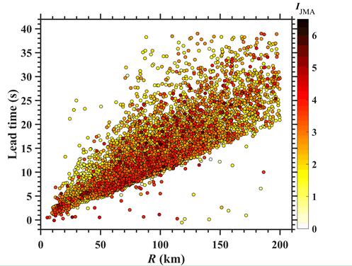 圖2 震中距和預警時間之間的關系。數據點的顏色代表地震烈度