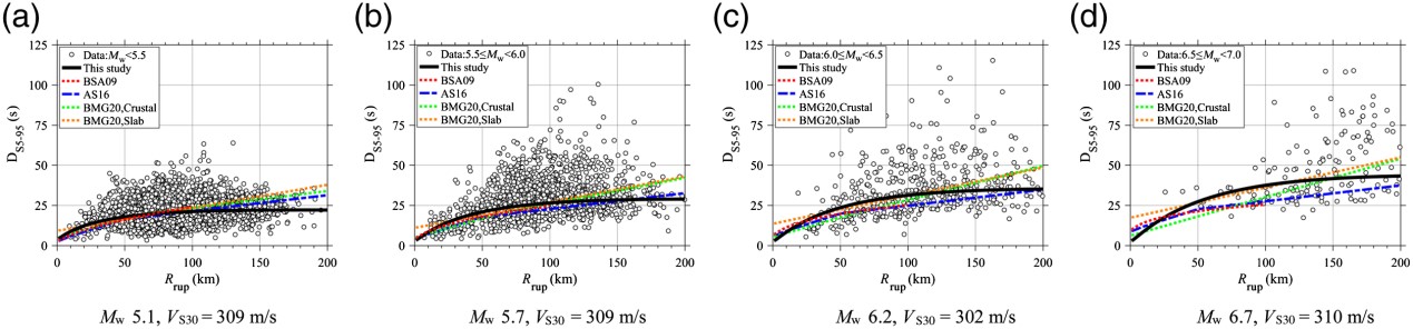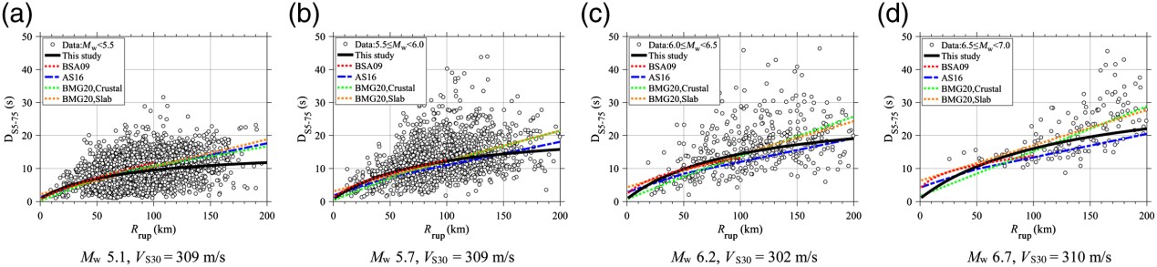 發(fā)布時(shí)間: 2023-04-11 點(diǎn)擊數(shù)量:123473)當(dāng)斷層距大于100 km時(shí),持時(shí)的SVR-GMMs預(yù)測(cè)結(jié)果小于BMG20(圖4)。當(dāng)M<5.5時(shí),顯著持時(shí)隨距離衰減存在明顯的遠(yuǎn)場(chǎng)飽和現(xiàn)象,顯著持時(shí)的飽和距離為100 km。本文開(kāi)發(fā)的SVR-GMMs有效地捕捉到了顯著持時(shí)存在的這一區(qū)域衰減特征。
