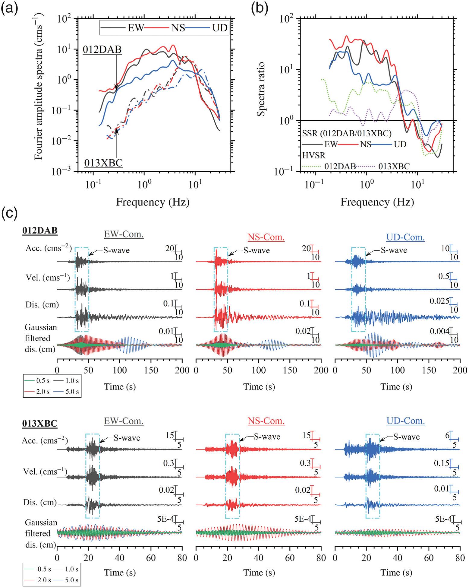 在數(shù)據(jù)質(zhì)量篩查和數(shù)據(jù)處理后,選取242組高質(zhì)量的地震動觀測記錄,首先利用垂直分量的擬加速度反應(yīng)譜(PSA)分析了唐山地震帶的地震動距離衰減(見圖1),發(fā)現(xiàn)該地區(qū)的非彈性衰減很強,但幾何擴展較弱(見圖2),采用不同的幾何擴散表達形式來描述幾何擴展,發(fā)現(xiàn)三段線性幾何擴散模型可以很好的表示唐山地區(qū)的地震動距離衰減,在中等距離(60-100km)處并未出現(xiàn)幾何擴展衰減。PGA和PGV的空間分布出現(xiàn)高烈度異常區(qū)域(寧河-寶坻地區(qū)、北京南部等),根據(jù)寧河-寶坻地區(qū)和北京南部的地震動標準譜比的寬頻帶、高幅值特征及體波后顯著的長周期面波(見圖3),寧河-寶坻地區(qū)出現(xiàn)非常顯著的2-5s的盆地誘發(fā)面波,說明這些地區(qū)存在顯著的盆地放大效應(yīng),盆地放大效應(yīng)造成了此次地震中的高烈度異常,這也可能是1976年唐山大地震中高強度異常區(qū)的原因之一。