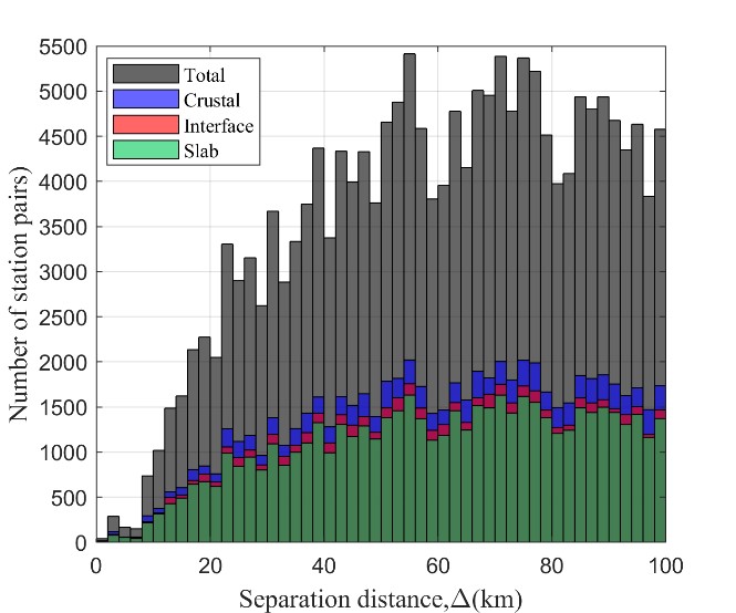 圖2 不同分離距離內的臺站對數及計算的相應的空間相關性值