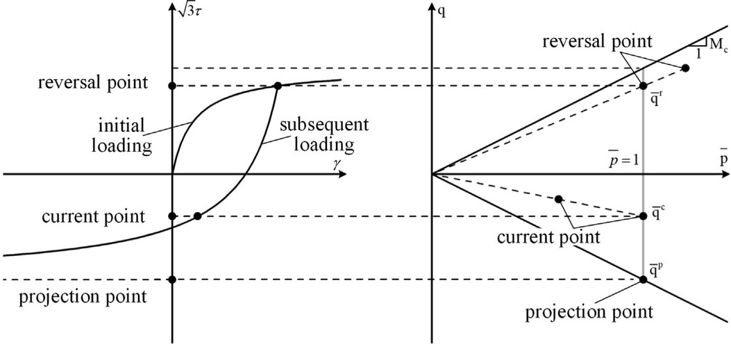 1.本文首先提出了一個便于工程應用的三維土體彈塑性本構模型。本模型基于邊界面模型理論,在歸一化偏平面中建立投影法則給出應力狀態參量(見圖1);采用土體材料模量與圍壓的經驗關系描述圍壓改變引起的土體模量變化;并根據偏應力不變量建立應力等效關系,將一維Pyke模型拓展到三維應力空間并以此推導塑形模量(見圖2)。