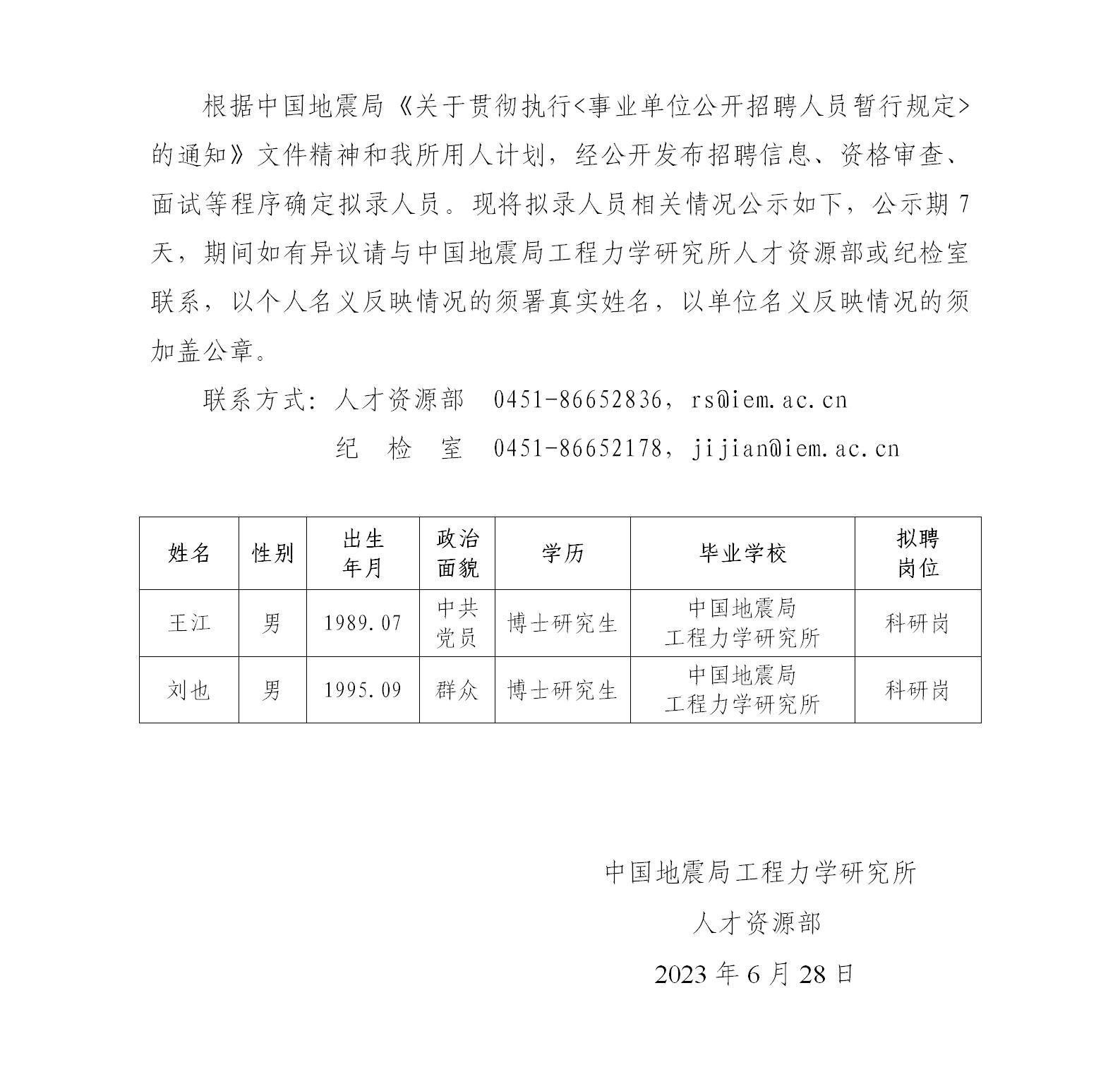 中國地震局工程力學(xué)研究所2023年擬錄用人員公示(二)